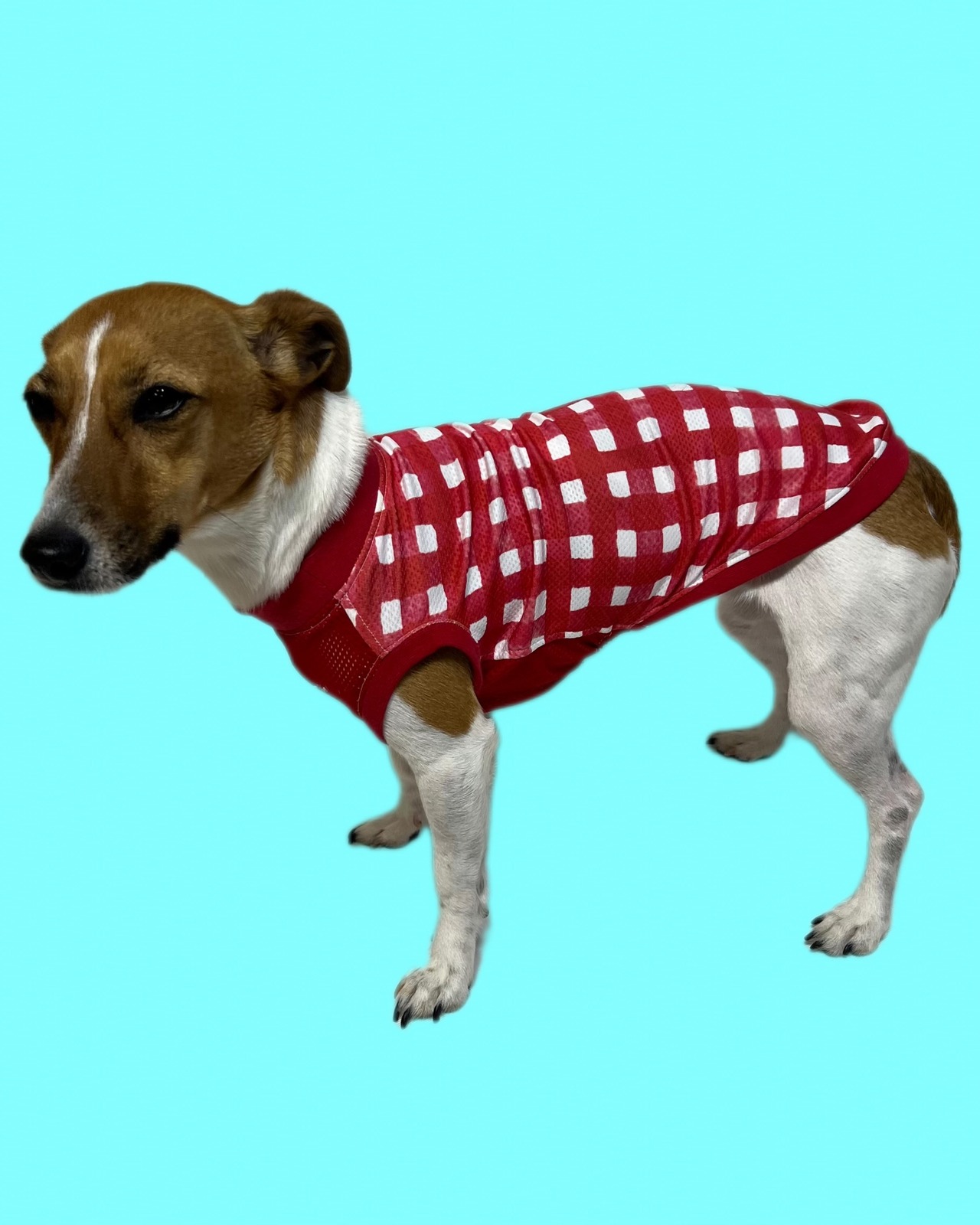 ◯ジャックラッセルテリア、ロンパース着用